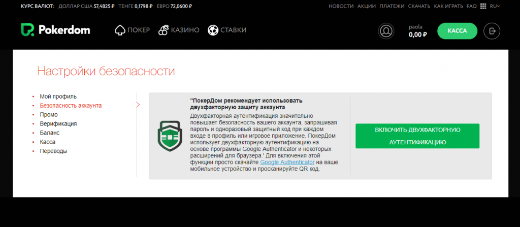 Тогда как в разделе «безопасность» можно подключить или отключить дополнительную двухфакторную защиту учетной записи. Если е активировать, то при каждом новом входе в аккаунт система безопасности покер-рума будет запрашивать единоразовый уникальный пароль, который высылается на верифицированный телефонный номер. Аналогичная защита аккаунта происходит посредством приложения Google Authenticator, которое инсталлируется пользователем на личное устройство.