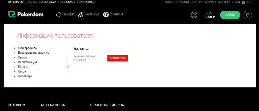С помощью кнопки «Касса» в ПокерДом допускается возможность пополнять или создавать заявки на кэш-бек в российских рублях, американских долларах, евро и казахских тенге, а также смотреть историю проводимых транзакций. В ней сберегаются всея информация по суммах, методах внесения средств и обналичивания выигрышей с вашего аккаунта.