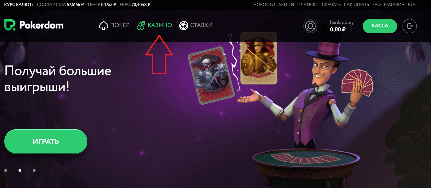 После этих простых манипуляций, можно начинать играть в онлайн рулетку на реальные деньги. Для этого, на сайте или в десктопном приложении PokerDom имеется раздел «Казино», после нажатия на который пользователь будет перенаправлен в новое диалоговое окно, где открывается перечень имеющихся азартных развлечений.