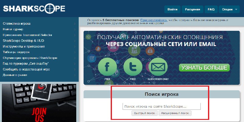 - На основной странице SharkScope находится «Поиск игрока».